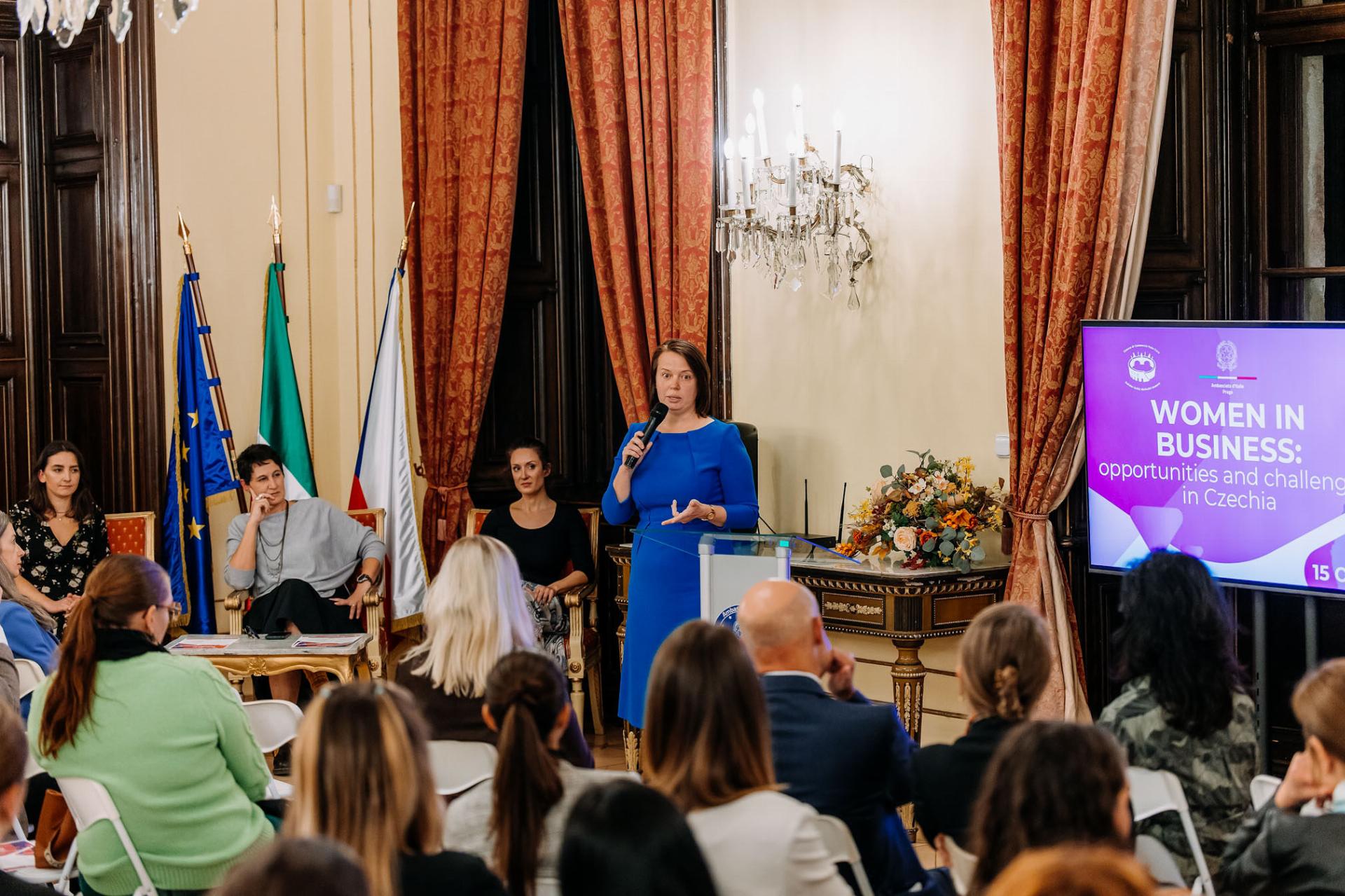 Mercoledì 15 ottobre, l’Ambasciata d’Italia a Praga, in collaborazione con la Camera di Commercio e dell’Industria Italo-Ceca (CAMIC), ha organizzato nei propri saloni di rappresentanza il nuovo appuntamento di “Women in Business”, una serie di iniziative dedicate alla promozione della leadership al femminile, all’accesso al mercato del lavoro e alle storie di successo settoriali. L’evento incentrato su “Opportunità e sfide nella Repubblica Ceca” è stato aperto dalla Vice Capo Missione dell’Ambasciata, Consigliera Laura Calligaro ed è seguita una tavola rotonda con la Capo unità per la Mobilità internazionale del lavoro e l’integrazione degli stranieri del Ministero del Lavoro della Repubblica Ceca, Petra Silovska, la responsabile dell’ufficio Marketing e distribuzione per l’Europa Centro-orientale del gruppo Generali, Elena Silvani, e la Transactions Product Manager presso Resistant AI, Lucie Rehakova. Le conclusioni sono state affidate alla Vice Direttrice e responsabile della sezione Politica dell’ufficio di rappresentanza della Commissione Europea nella Repubblica Ceca, Eva Horelová. L’incontro si è tenuto alla presenza di numerosi rappresentanti delle istituzioni, del mondo imprenditoriale e di giornalisti.