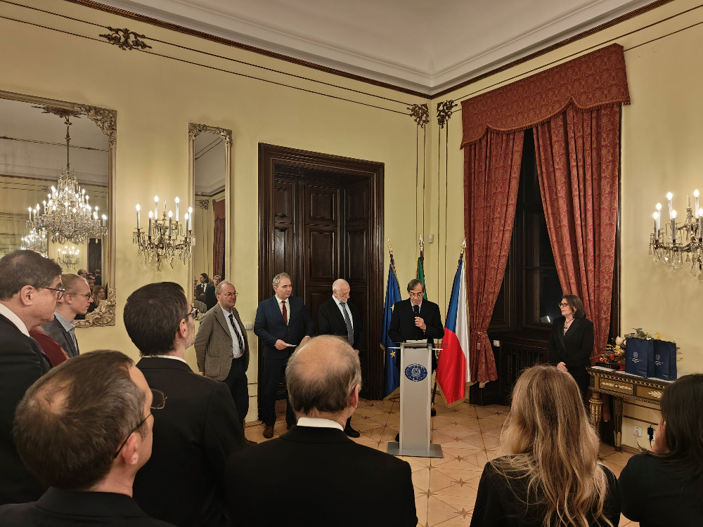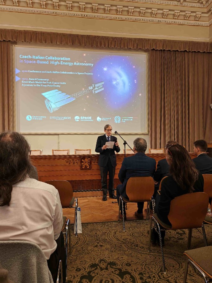 La conferenza, presieduta dal Presidente della AVČR, professor Radomír Pánek, e dal Presidente dell’INAF, professor Roberto Ragazzoni – è stata aperta dagli interventi del Ministro dei Trasporti Martin Kupka e dell’Ambasciatore d’Italia Mauro Marsili, ha visto la partecipazione di oltre 80 scienziati italiani e cechi e si è conclusa con il conferimento del prestigioso riconoscimento, seguita dalla lectio magistralis di Enrico Costa “A Journey to the X-ray Polarimetry”. Il dialogo scientifico è proseguito nei saloni di rappresentanza dell’Ambasciata d’Italia, dove l’Ambasciatore Mauro Marsili ha ospitato un ricevimento con numerosi rappresentanti istituzionali, accademici e scienziati di entrambi i Paesi per discutere le prossime tappe della ricerca astrofisica e per celebrare il prestigioso riconoscimento. Il diplomatico italiano ha sottolineato che “La Ernst Mach Medal per la Fisica assegnata al dottor Enrico Costa va considerata anche un riconoscimento ai risultati ottenuti dalla ricerca spaziale italiana e alle capacità di un ecosistema all’avanguardia che investe in ricerca, innovazione tecnologica e cooperazione internazionale. Una ulteriore conferma del rapporto di stima e amicizia che lega l’Italia alla Repubblica Ceca”.